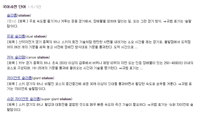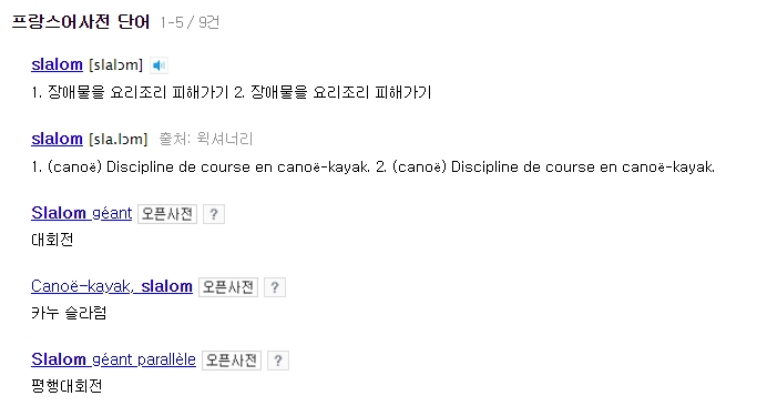 슬라럼의 프랑스어 사전적 뜻은 장애물을 요리조리 피해가기다. 프랑스에서는 카누라는 종목에서도 사용되며 결국 어떤 장애물을 두고 요리조리 피해 가며 운동 능력을 심사하는 개념으로 사용된다.